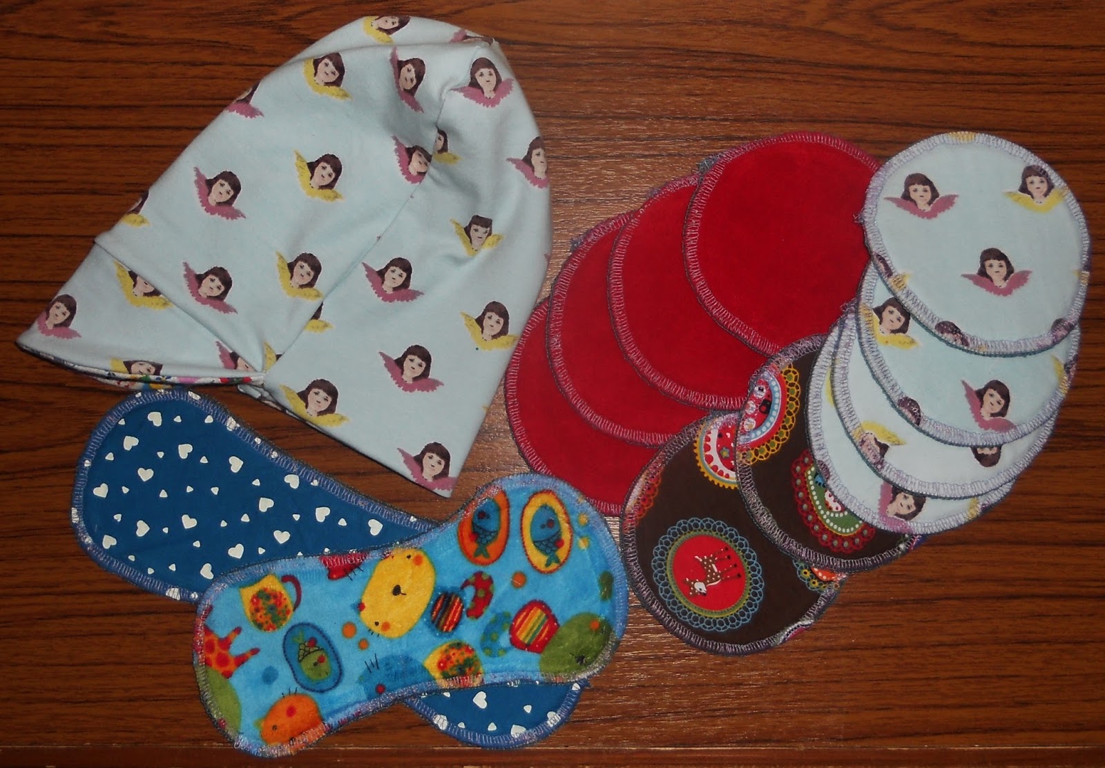 Vietin taas aamupäivän saumurilla. Tulokseksi sain enkelikuvioisen lippapipon S:lle ja itselleni liivinsuojia ja pari kestosidettä. Imuna on bambufleeceä, punainen on joustofroteeta, enkelikangas on paksua trikoota, kissa-aiheinen kangas toisessa siteessä on puuvillavelouria ja kaksi muuta vielä ihan tavallista puuvillatrikoota.